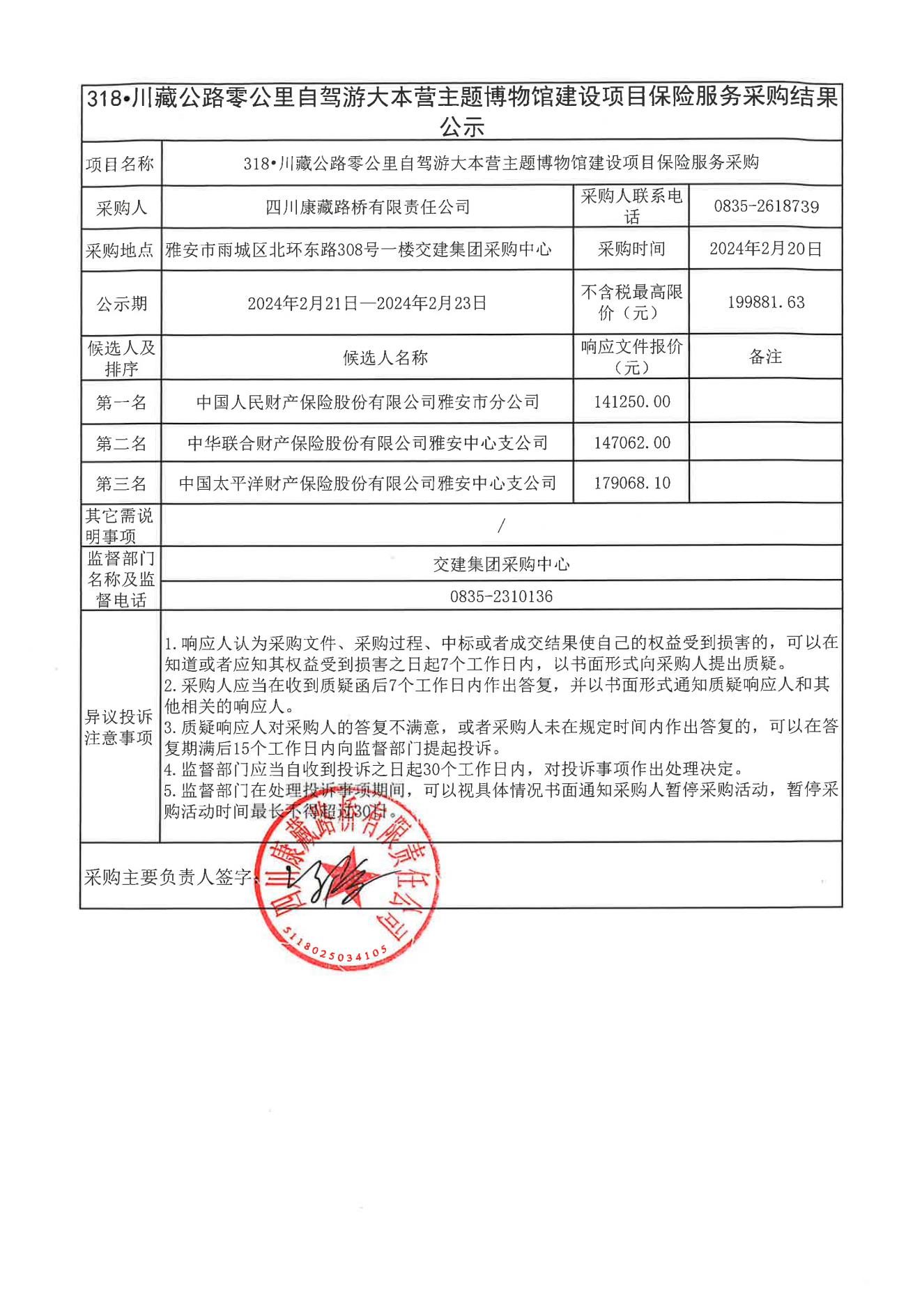 四川康藏路橋有限責(zé)任公司318•川藏公路零公里自駕游大本營主題博物館建設(shè)項(xiàng)目保險服務(wù)采購結(jié)果公示