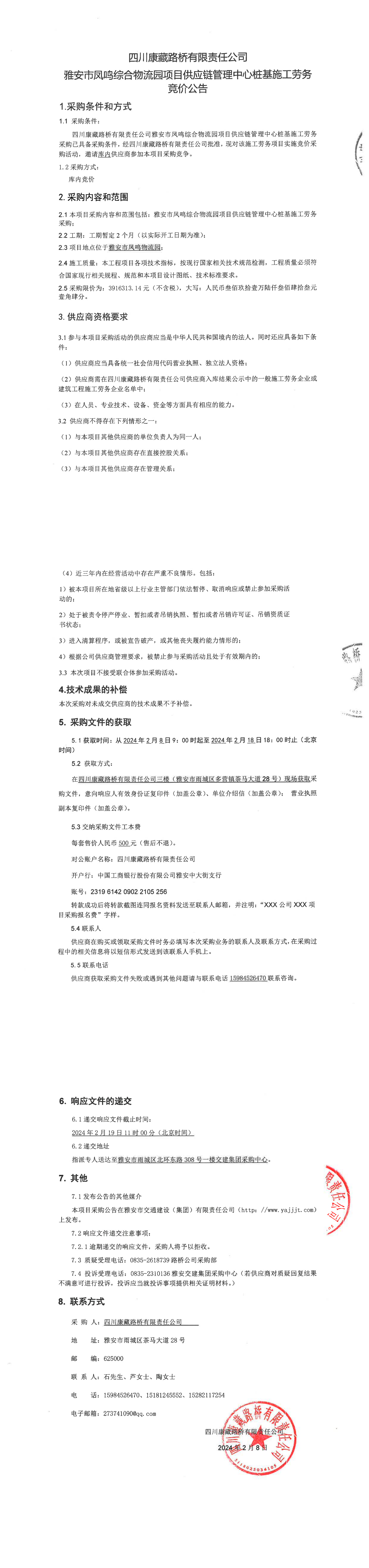 四川康藏路橋有限責任公司雅安市鳳鳴綜合物流園項目供應鏈管理中心樁基施工勞務采購公告